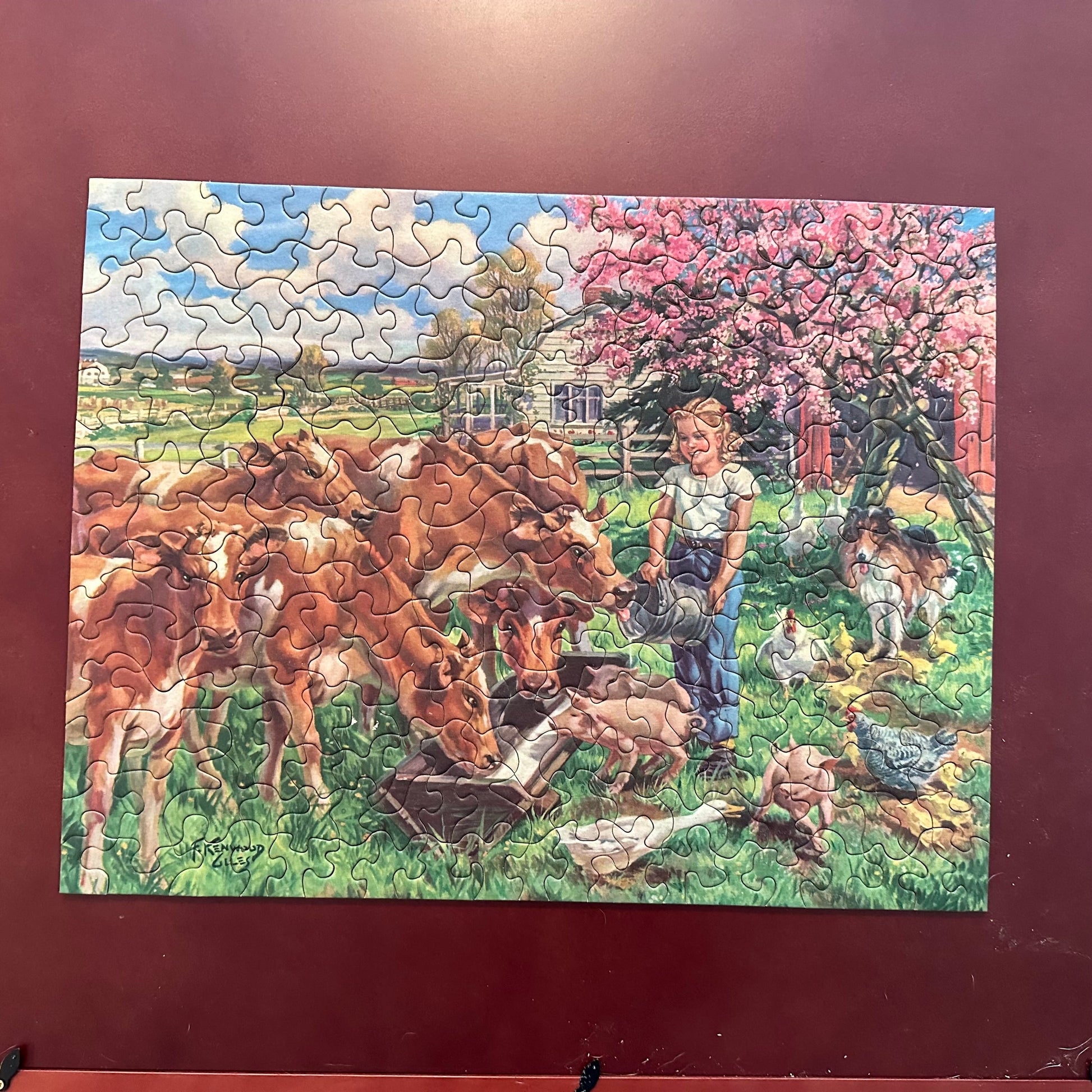 A vintage jigsaw puzzle by Tuco featuring cows grazing. It is made of extra heavy cardboard. It is in excellent vintage used condition. The box has some wear due to age and some writing on it as seen in the pictures.