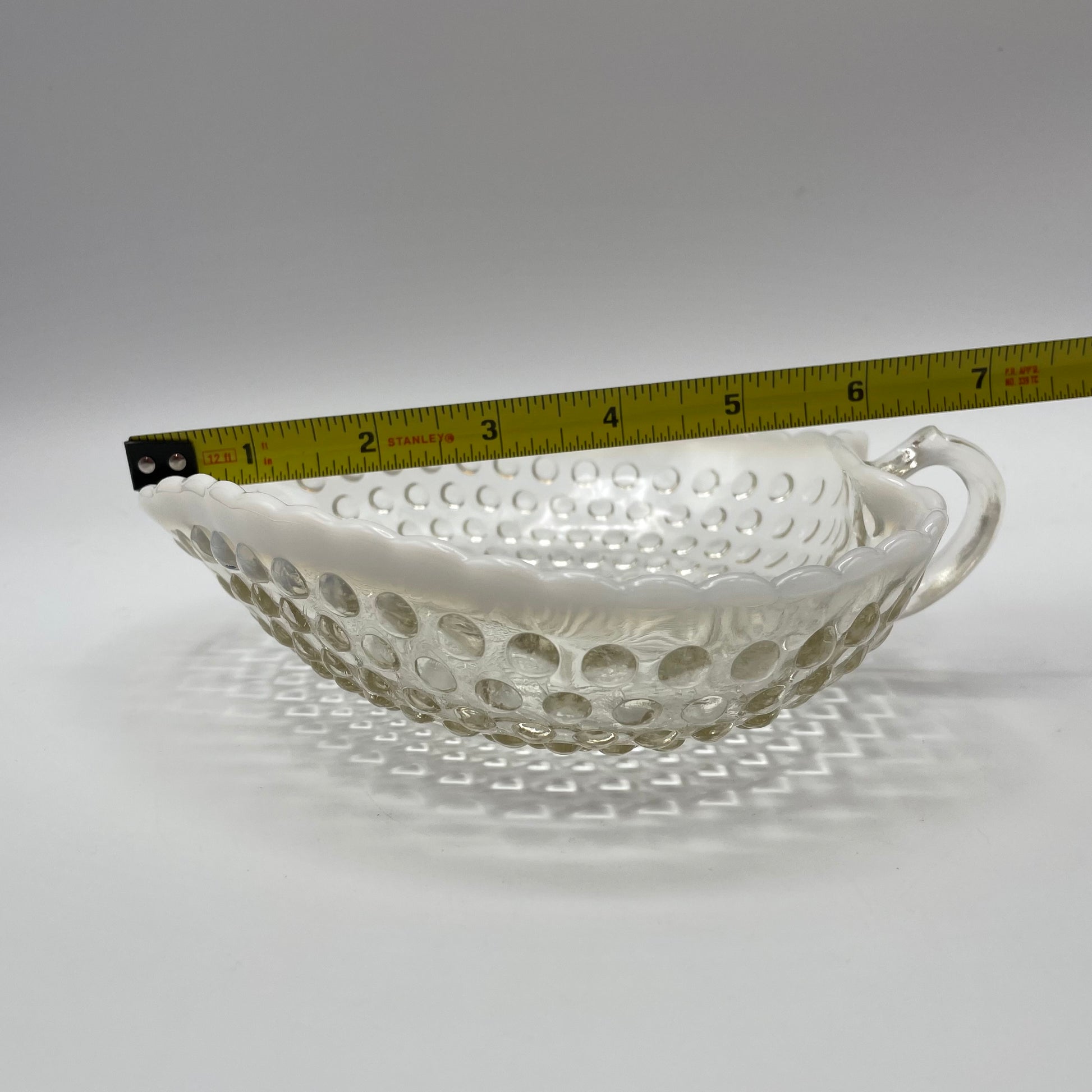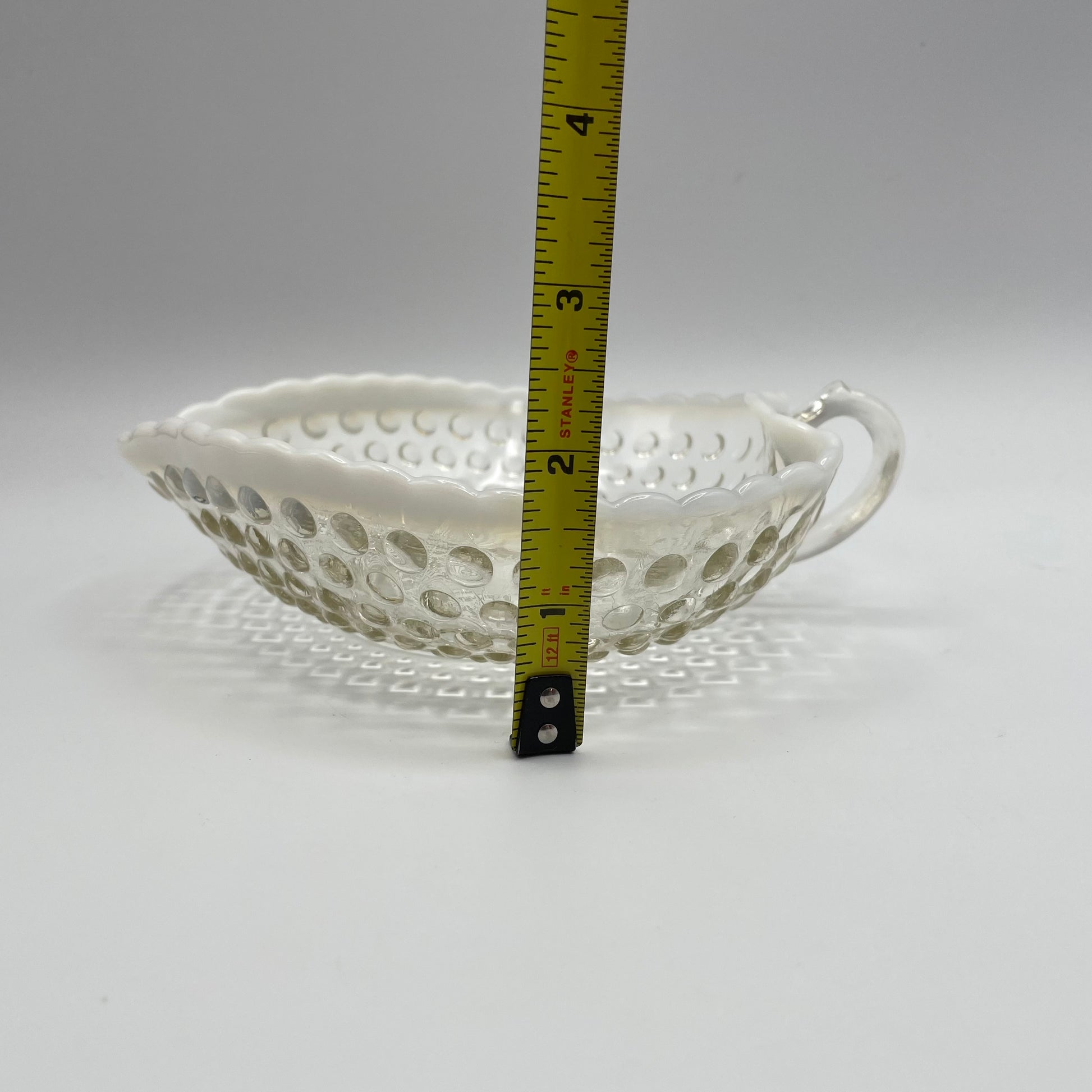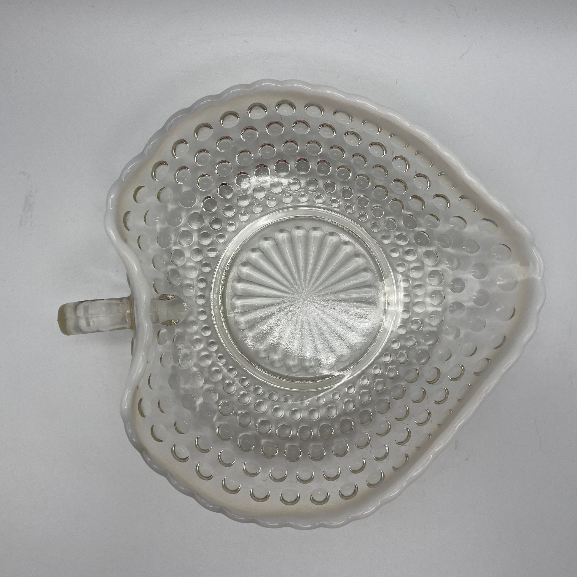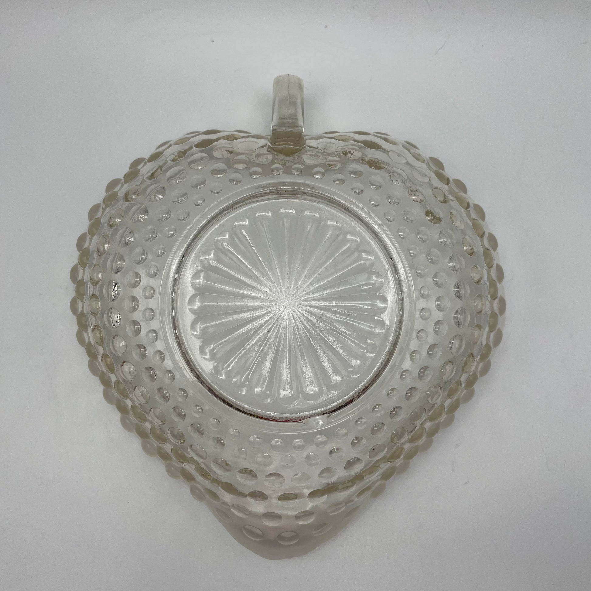 A beautiful vintage Anchor Hocking Moonstone Opalescent Hobnail heart-shaped dish with a handle. The dish measures approximately 7" long x 6 3/8" wide x 2" deep. It is in excellent vintage used condition.