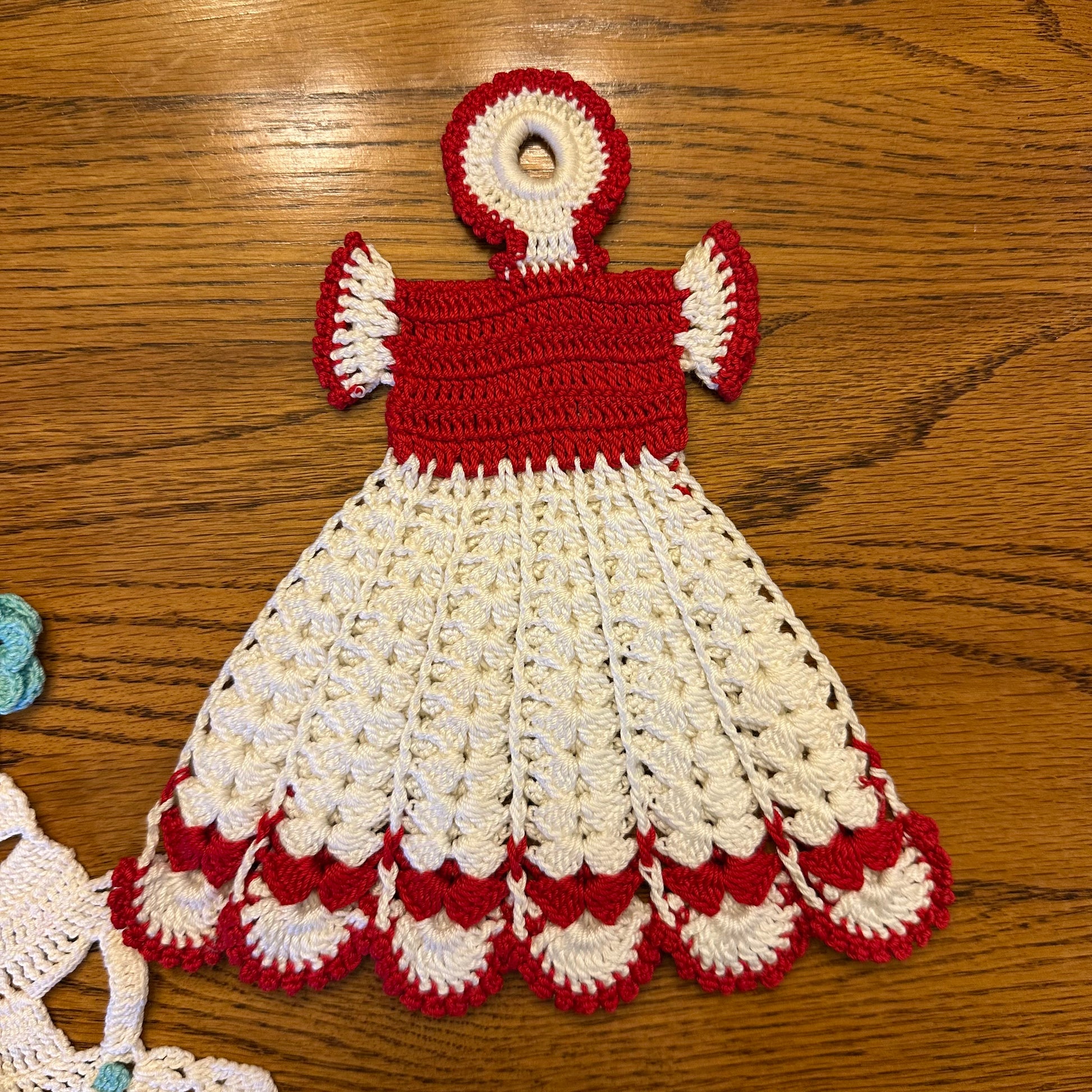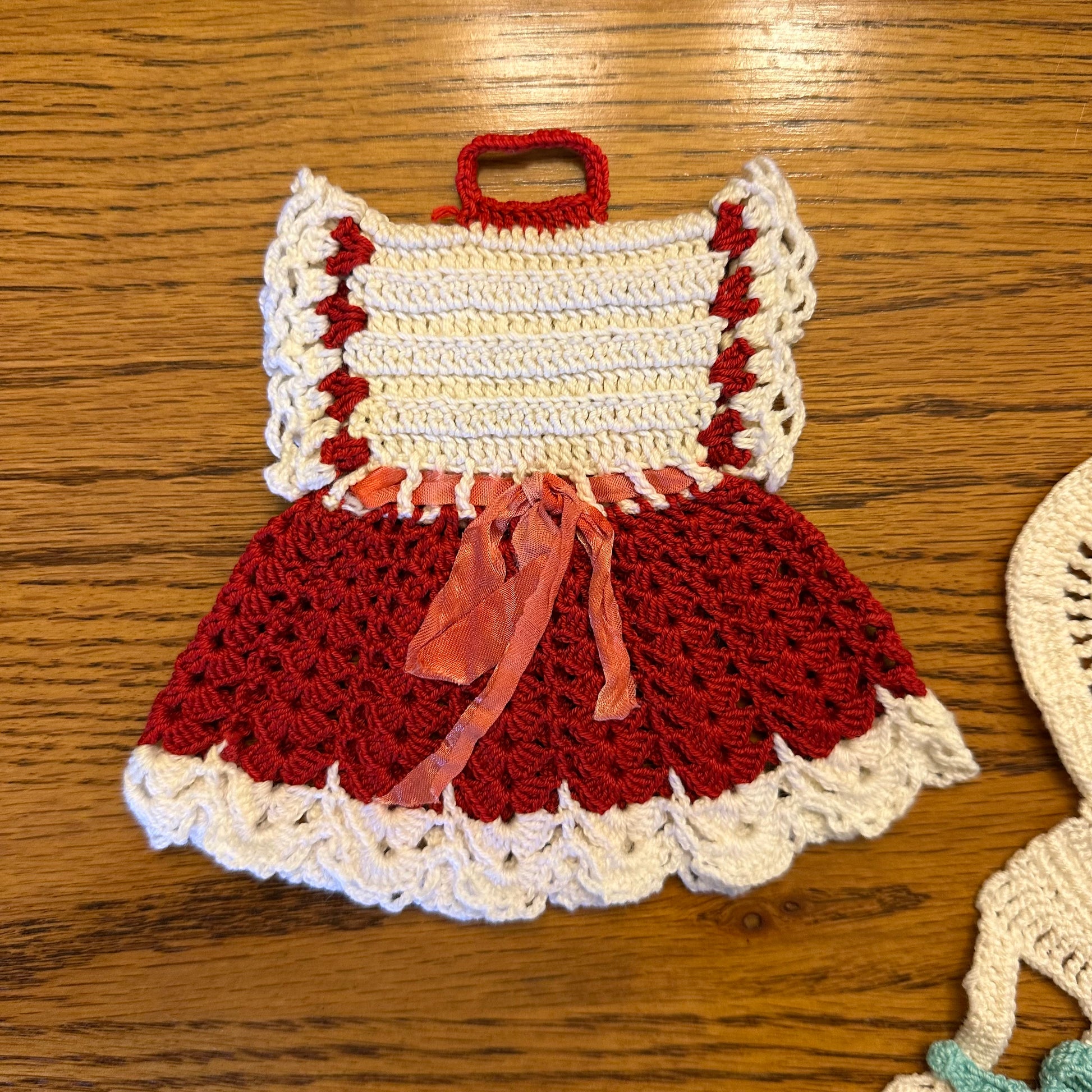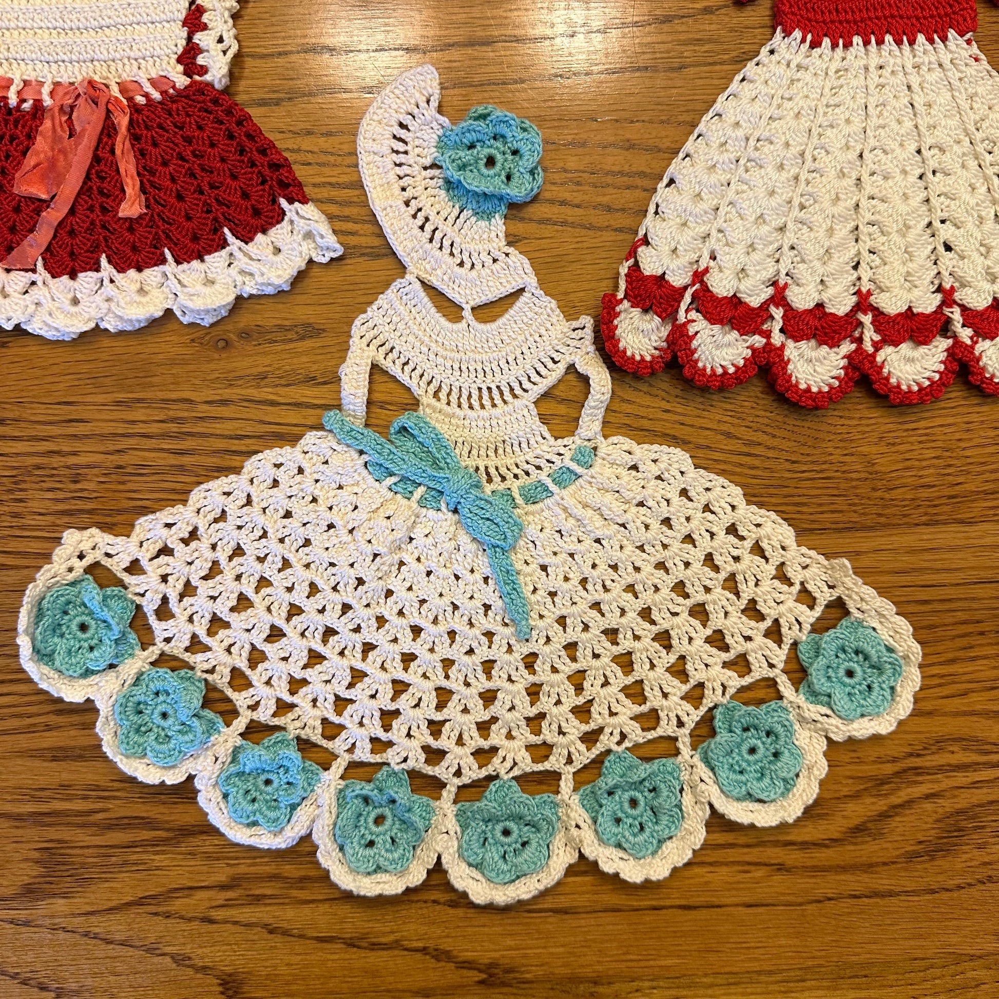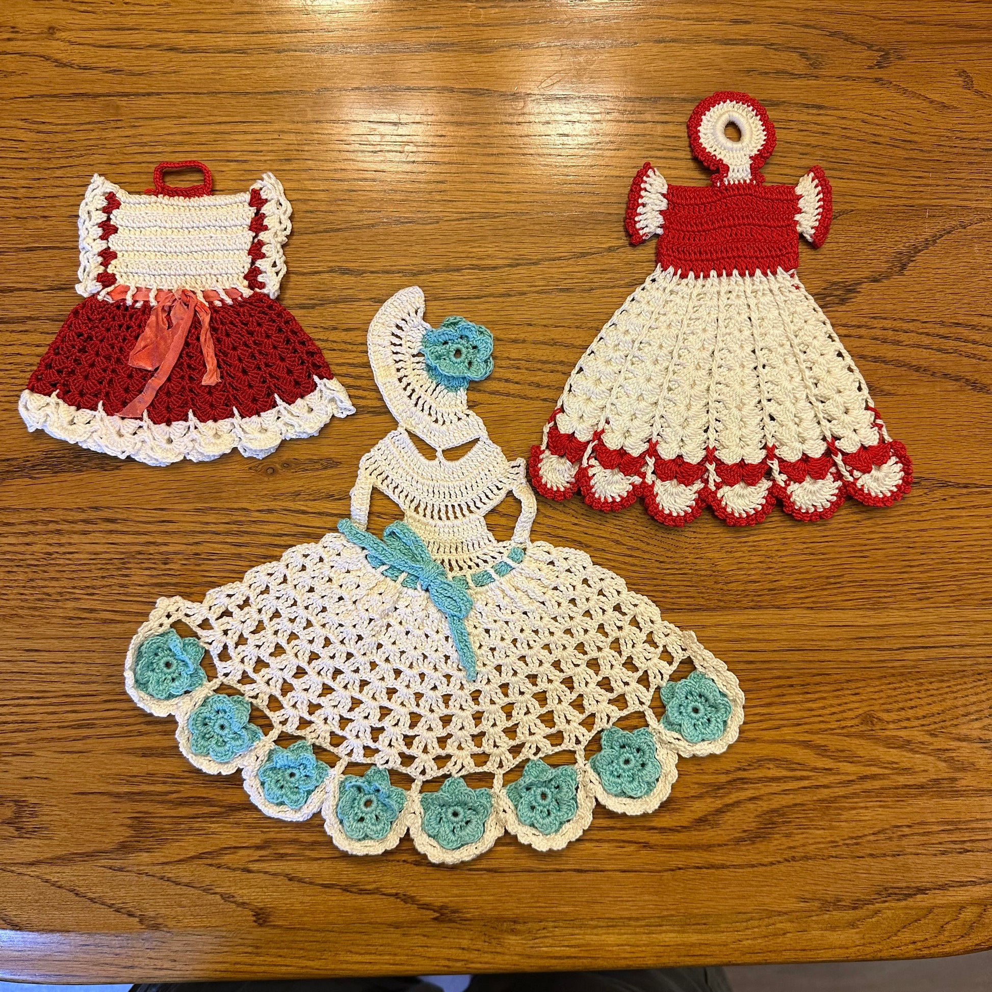 This listing includes a set of three hot pads, each featuring a distinct dress design in various colors. These hot pads are in excellent vintage, pre-owned condition, making them a charming addition to any kitchen or dining area.