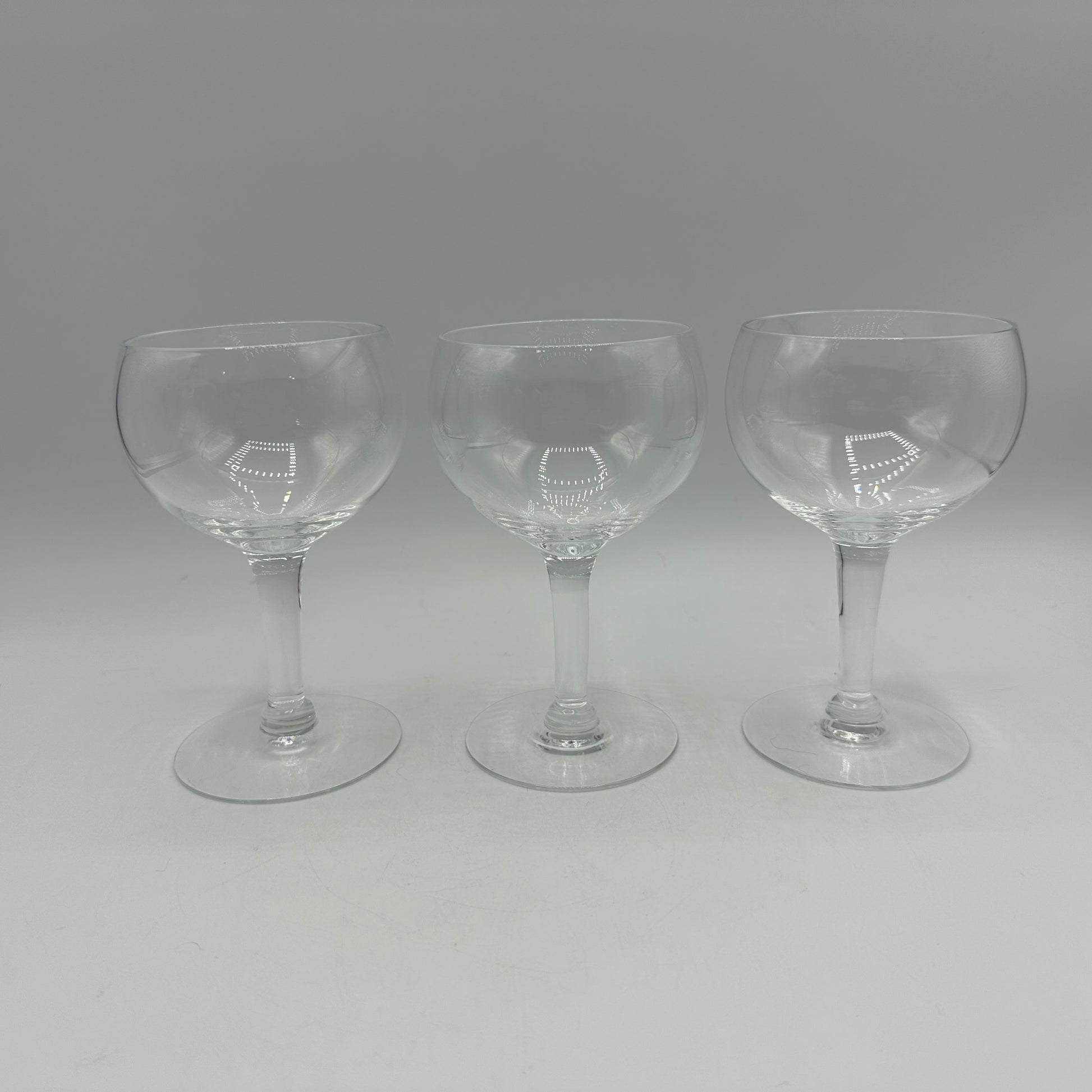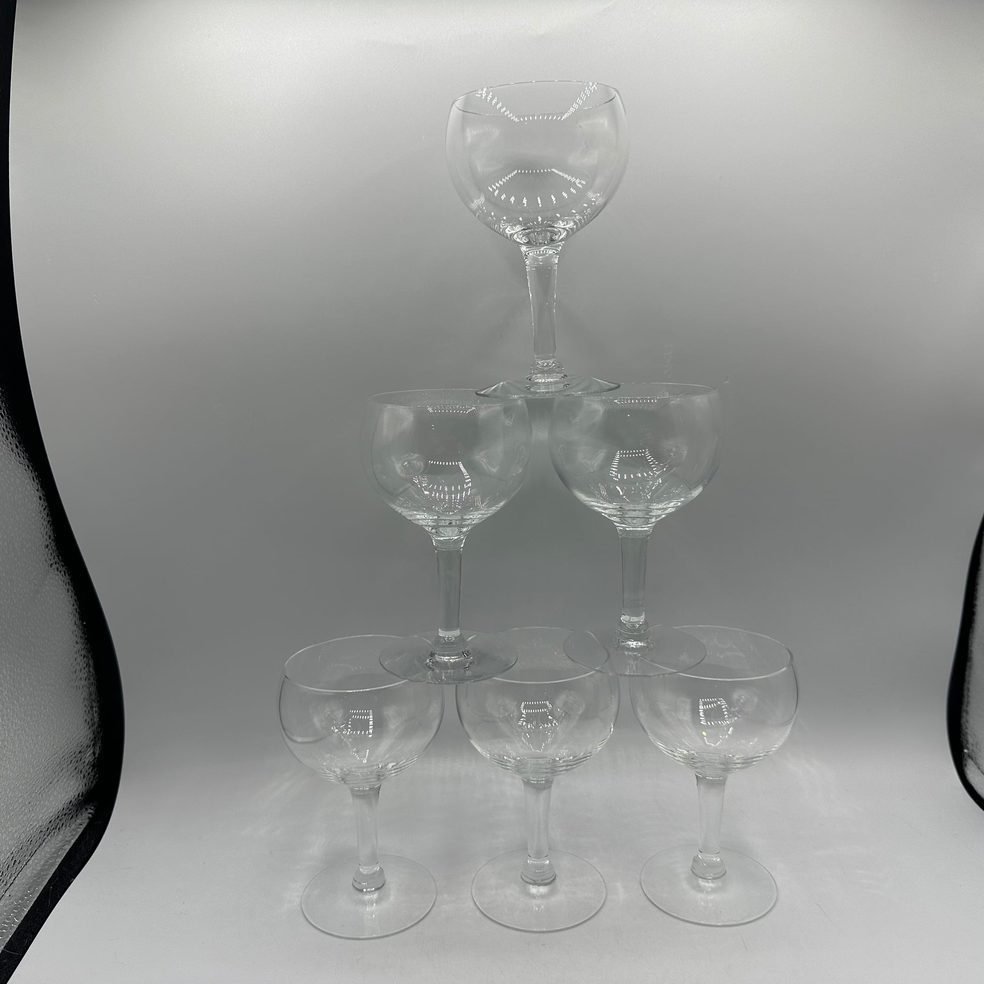Here’s a delightful set of 6 wine glasses that you’ll absolutely love! They feature a simple yet elegant bowl and a clear stem that adds a touch of class to any occasion. Plus, they're in excellent vintage condition, showing their charm and character as pre-owned pieces. Enjoy sipping your favorite wines in style!